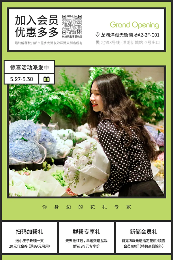 打造洋湖板塊首家沉浸式花園中心,以鮮活芬芳為長沙再增添一處綠色新地標。與龍湖的結緣,也是出于愛與感動。因為在都市的繁華里,龍湖天街一直所做的也正是,以品味高質生活,犒賞生命的美好!精筑溫暖生活,沉淀萬千家與愛的故事。一站式鮮花農場集市,堅持“海量品種,低價格,高品質”的經營理念,讓鮮花成為生活必需品,走進長沙的千家萬戶。